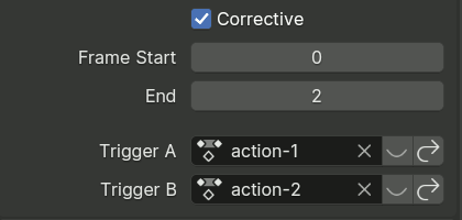 The progress of the corrective action from the start to the end frame is calculated as the product of the progress values of the two trigger actions. Thus, the start frame is applied when either of the triggers is at the start frame, and the end frame is used when both are at their end frame.
