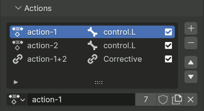 列表条目显示了动作的名称、触发器(骨骼或由另外两个驱动的纠正动作),以及一个复选框,该复选框可用于暂时禁用将此动作应用于绑定。条目开头的图标从动作图标更改为链接图标,以突出显示依赖于活动普通动作的纠正动作,或活动纠正动作使用的普通动作。