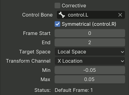 启用后,动作中的左侧骨骼关键帧将由左侧控件控制,右侧骨骼关键帧由右侧控件控制。没有方向后缀的骨骼被认为属于角色的中心。它们被绑定了两个影响为 0.5 的动作约束,由每个控制骨骼控制。