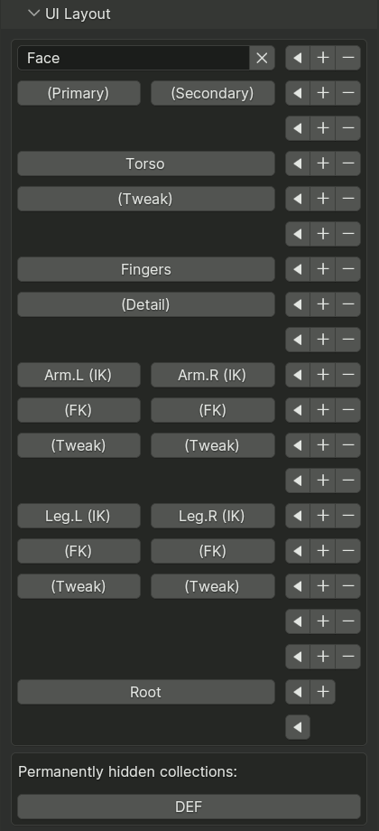 Rigify 可以利用集合为最终绑定生成额外的功能和用户界面。一个用按钮生成的名为绑定层的面板,用于隐藏集合并以直观的布局排列。