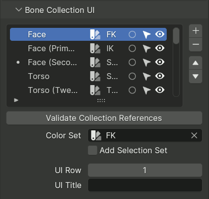 这两个颜色字段分别定义了 选定 和 活动 颜色。默认情况下,Rigify 从用户在 Blender 首选项中定义的主题中读取这些颜色。这样,选定/活动 颜色在 UI 中始终具有可预测和一致的行为。您可以通过单击相关颜色字段来定制颜色。要将它们重置为 Blender 当前主题值,只需单击带有更新图标的按钮。