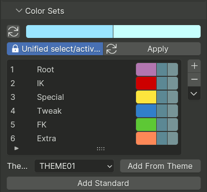 要将预定义的 Rigify 默认配色方案(如图所示)中的颜色添加到列表中,请单击 添加标准 按钮。