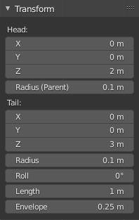 最后,您可以在侧栏的 变换 面板中编辑活动选定骨骼的两个关节的位置和半径,以及滚动旋转。