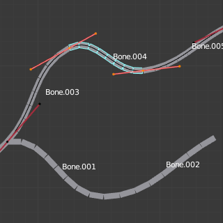 贝塞尔手柄由手柄骨的头部(尾部)相对于当前骨骼的头部(尾部)的 位置 控制。请注意,要使其正常工作,这些骨骼之间必须有非零距离。如果手柄也是B-Bone,则应用额外的处理以进一步平滑过渡,假设骨骼实际上形成了一条链。