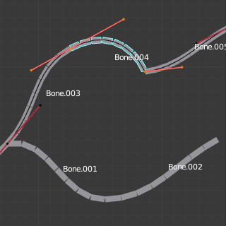 Blender将柔性骨骼看成通过骨骼关节的贝塞尔曲线一部分。每个 段数 将弯曲并滚动以遵循这看不见的贝塞尔曲线代表此的曲线细分点。曲线两端的控制点是骨骼的端点。样条骨(B-bones)的形状可以是受控制使用一系列的属性或间接邻近的骨骼(即第一个子级和父级)。骨骼两端的手柄以控制曲率。
