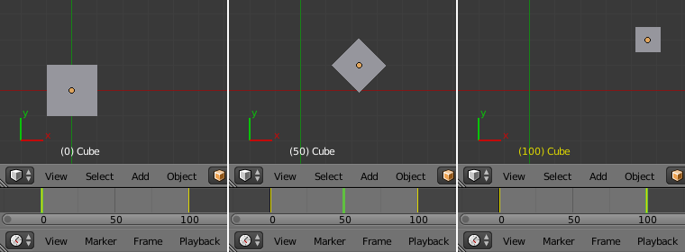 在物体模式下选择立方体,在3D视图按下 I.这将记录立方体在第一帧的位置、旋转和比例。