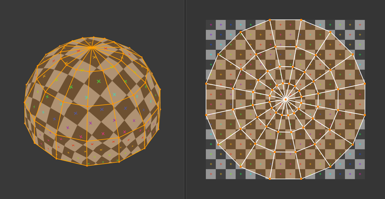 在上图中,三维空间中的圆顶在 UV 空间中被平铺成一个圆盘。然后在 UV 贴图中将每个 3D 面与其覆盖的图像部分进行纹理处理。
