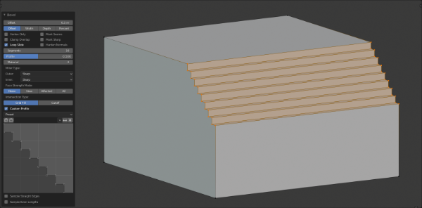 大小介于 0 到 1 之间,用于控制倒角的轮廓(倒角边侧视)形状。默认值为 0.5,轮廓为圆弧形(如果这些面以正确的角度相连)。低于该值,轮廓变得平坦,0.25 为平面,低于 0.25 为内凹的倒角。该值大于 0.5,倒角面更加突出。与 段数 类似,该值可以在按下 P 后移动鼠标或输入数值修改。