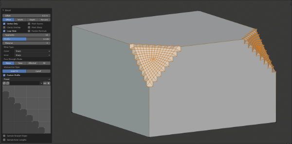 倒角 工具在选定顶点的位置上将网格的边缘或角落磨圆。在 "(仅)顶点" 模式下,顶点倒角 工具在选定的顶点上工作,但也可以选择切换到 边线倒角。通过这样做,更多的顶点被添加进来,以便用指定数量的 段 来平滑剖面(关于倒角算法的细节,见下面的选项)。