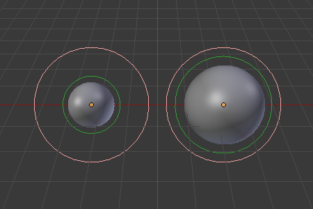 控制单个融球元素的影响范围,不像 影响阈值 控制整个融球家族的影响。这基本上定义了一个融球对受其他融球影响的敏感程度。在刚度较低的情况下,融球将开始从更远的地方变形。较高的值意味着融球需要靠近另一个融球才能开始合并。刚度 由 绿色环 可视化,可以选择缩放,也可以更改 刚度 值。