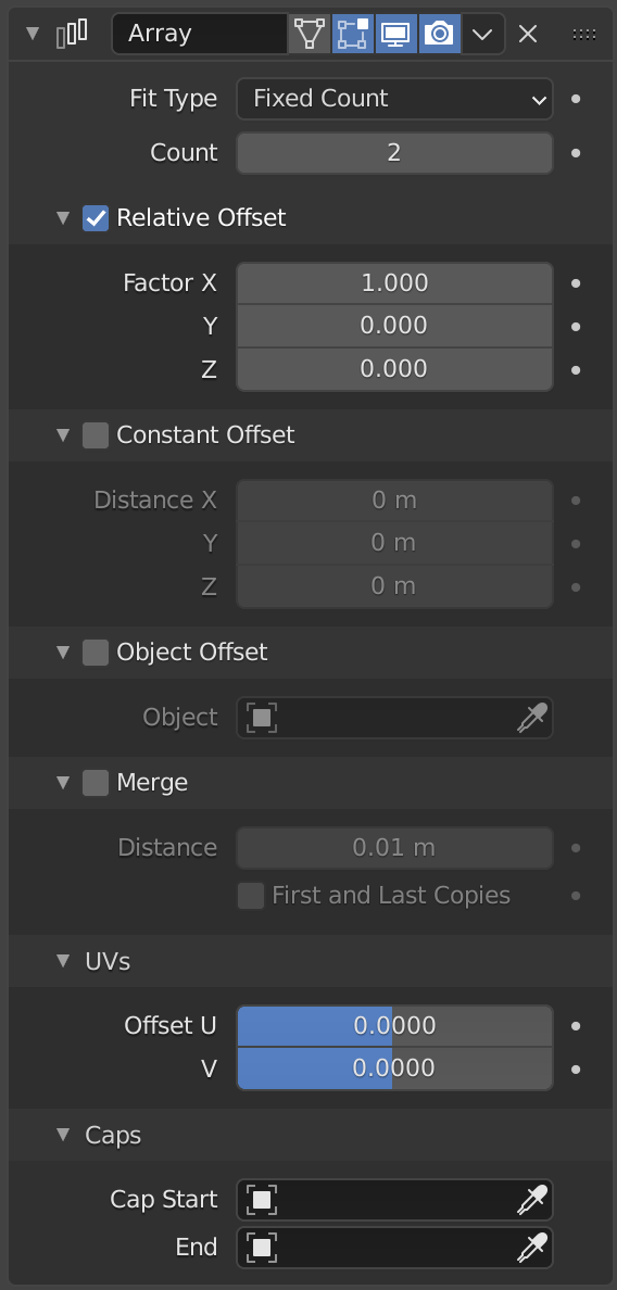 从一个副本应用到下一个副本的变换计算为三个不同分量的总和(相对、固定 和 物体),每一个都可以单独启用或停用。例如,可以取相对偏移为 (1.0, 0.0, 0.0),固定偏移为 (0.1, 0.0, 0.0),给出一组沿 X 轴整齐排列的物体阵列,它们之间的距离恒定为 0.1,无论原始物体的大小如何。