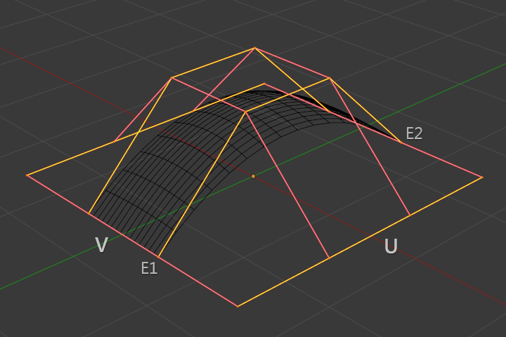 在此图中,U 插值轴标记为 "U",V 插值轴标记为 "V"。U 的插值轴已设置为 端点,因此曲面现在沿着 U 插值轴从 E1 到 E2 延伸外边线。