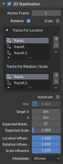 二维稳定板被用来定义用于拍摄的二维稳定的数据。此面板中有几个选项可用:您可以添加一个轨迹列表以确定横向图像移动,以及另一个轨迹列表以确定倾斜和缩放移动。根据这些轨迹的平均贡献,计算补偿运动并应用于每个帧。