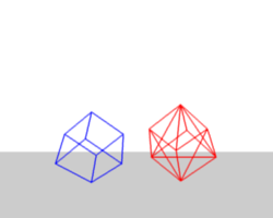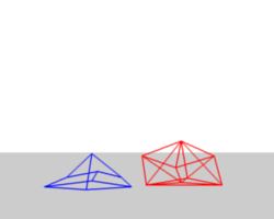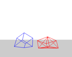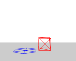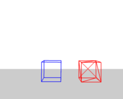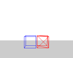 To show the effect of the Stiffness setting, we will drop two cubes onto a plane (see Collisions). The blue cube uses quads, while the red one uses triangles. Both cubes have their Goal setting disabled.