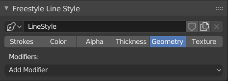 几何数据¶ 在此选项卡中,您可以控制描边的几何图形。它仅包含添加修改器的选项。 因为它们始终完全应用于描边的几何图形(就像物体修改器一样)。它们从 Freestyle 线条集中获取生成的二维笔画,并以各种方式替换或变形它们。 与Blender中的其他修改器堆栈一样,它们从上到下应用。 线条样式:几何图形。¶ 修改器¶ 类型¶ 2D 偏移 2D 变换 支柱拉伸 贝塞尔曲线 蓝图 引导线 柏林噪波 1D 柏林噪波 2D 多边形化 采样 简化 正弦置换 空间噪点 尖端移除