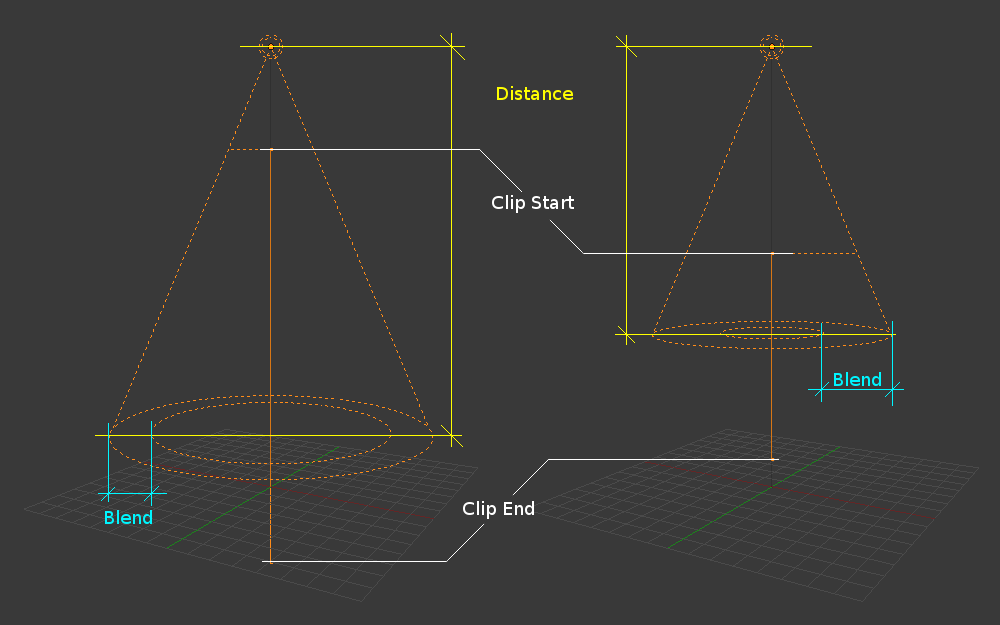 要使斑点具有更清晰的衰减率,从而减少模糊/柔和的边缘,请减小 Blend 的值。将 Blend 设置为0.0会产生非常清晰的聚光灯边缘,而不会在光影之间产生任何过渡。