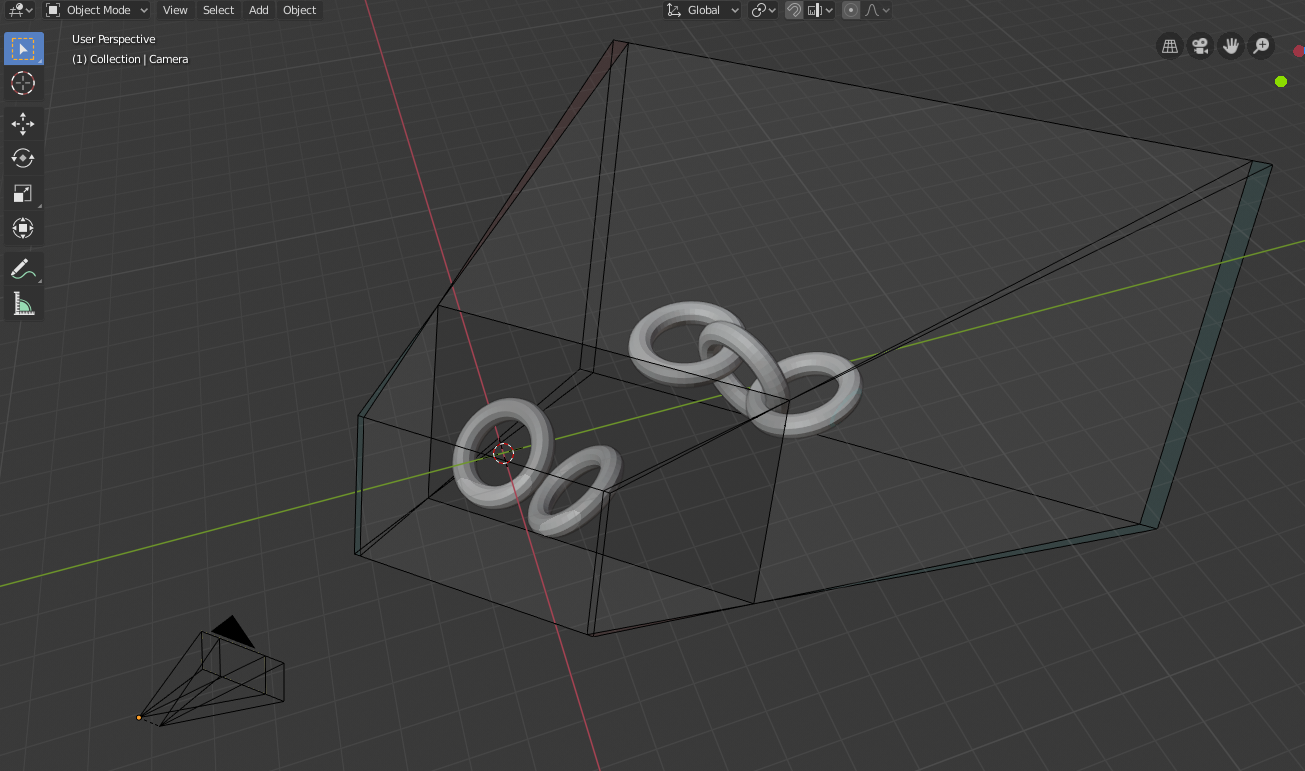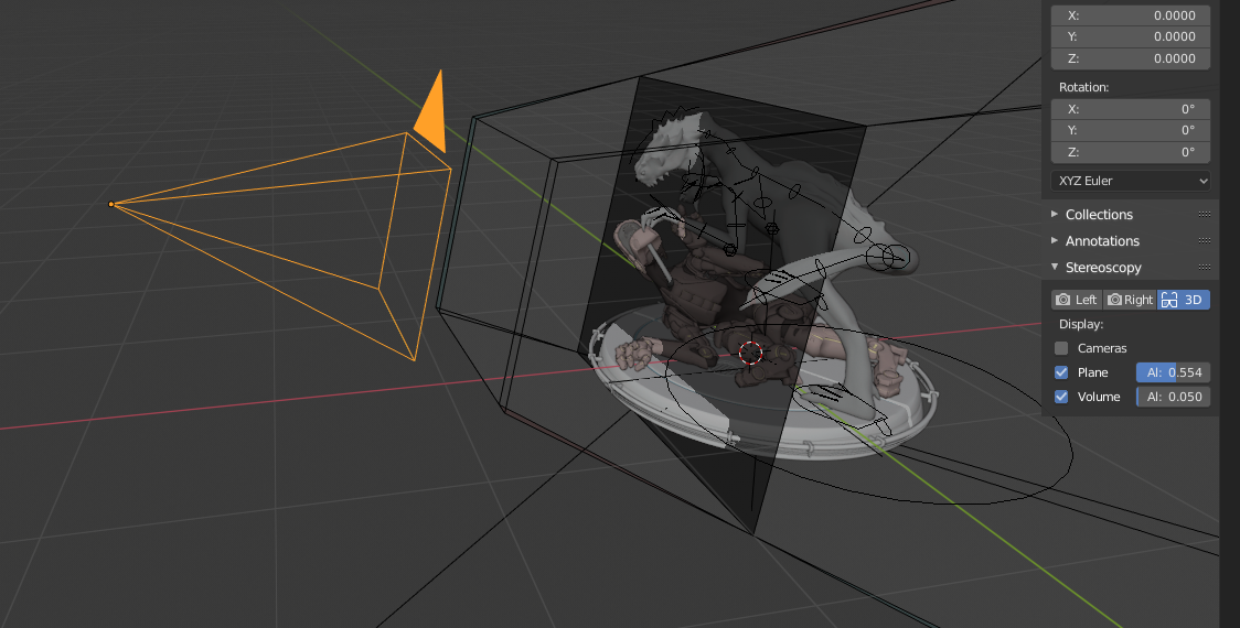 您可以在 3D 视口侧栏的 “立体视法” 面板中切换此显示设置和其他显示设置。在下图中,相机的视锥体体积也可见。