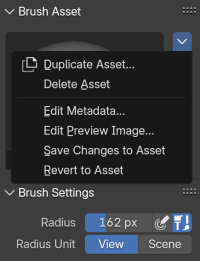 使用资产操作:使用来自任何 Blender 文件的实用操作符创建和更新笔刷资产。存储由 Blender 管理。方便对个人笔刷资产库进行简单的 “即时” 管理。