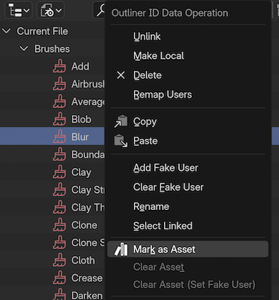 在大纲中对笔刷使用的 标记为资产 操作。¶